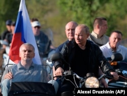 Уладзімір Пуцін кіраваў матацыклам «Урал» з расейскім сьцягам і каляскай, у якой сядзеў кіраўнік расейскай адміністрацыі Крыму Сяргей Аксёнаў. Побач з Пуціным на іншым матацыкле ехаў байкер Аляксандр Залдастанаў, вядомы як Хірург. На сьцягу у Залдастанова, як адзначае BBC, можна было бачыць дзіўны знак, які становіць сабою гібрыд гербаў СССР і Расеі.
