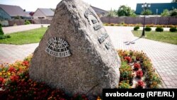 Людміла Станіславаўна падводзіць мяне да агароджы школы, за якой бачны кавалак роўна вычасанага каменя. Гэта кавалак помніка Галуўку. На ім нават ёсьць адпаведны надпіс.