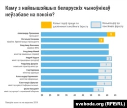 Лукашэнка працуе ўжо 5 гадоў пасьля надыходу пэнсійнага ўзросту, міністар адукацыі — 4 гады, кіраўніца адміністрацыі Лукашэнкі — 3 гады, на пэнсію ўжо могуць ісьці кіраўнікі міністэрстваў замежных справаў і надзвычайных справаў.