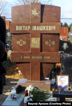 Эпітафія на надмагільнысм помніку зробленая зь верша, які паэт Анатоль Сыс прысьвяціў Віктару Івашкевічу; у арыгінале –