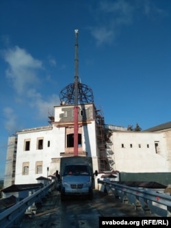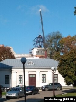 Каркас ужо зьнялі зь вежы. Канчаткова ўсталёўваць і абшываць купал будуць пазьней.