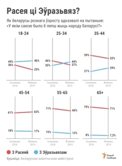 Раней эўрапейская дамінанта назіралася толькі ў групе самых маладых рэспандэнтаў — 18-24 гадоў. Зараз упершыню за ўвесь пэрыяд вымярэньняў дадалася наступная ўзроставая група — 25-34 гадоў, у якой праэўрапейская арыентацыя пераважае прарасейскую. І гэта фундамэнтальны зрух.