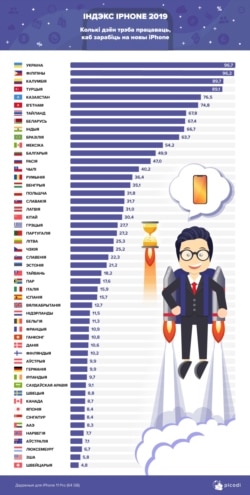 Антырэкорд сярод краін у сьпісе належыць Украіне: у гэтай краіне сярэднестатыстычны жыхар павінен ашчаджаць грошы з заробку на новы iPhone 96,7 дня. У такіх краінах, як Расея і Польшча, новы гаджэт раўназначны па цане 47 і 31,8 працоўныя дні.