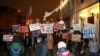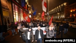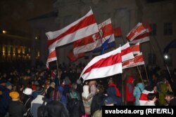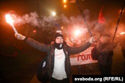 З Пляца Волі ўдзельнікі акцыі выврушылі да будынку ЦВК. Некаторыя запалілі фаеры: