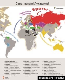 Свабода паглядзела, што Аляксандар Лукашэнка казаў пра розныя краіны і рэгіёны сьвету і склала мапу паводле ягоных выказваньняў.