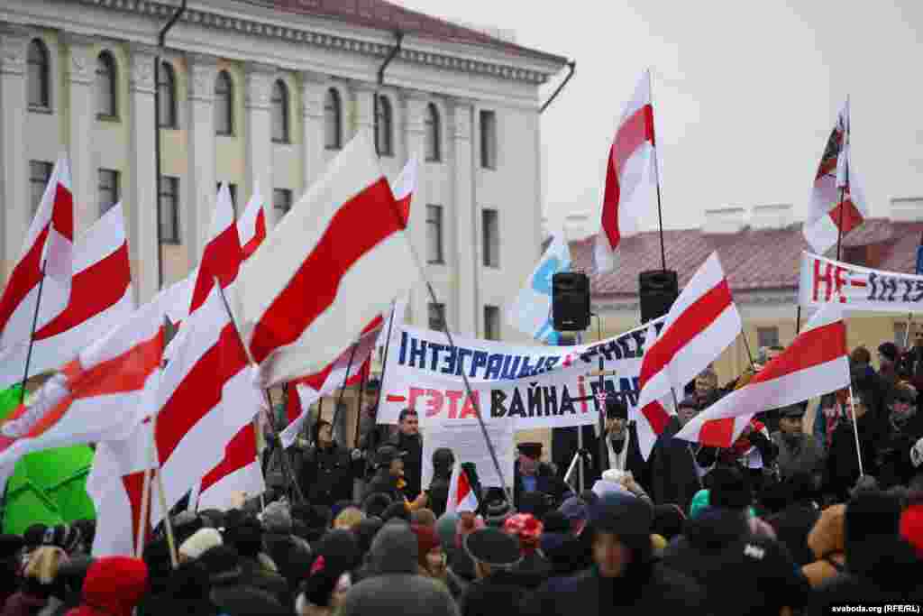 Удзельнікі несанкцыянаванай акцыі пратэсту супраць інтэграцыі з Расеяй, якая прайшла 21 сьнежня на Кастрычніцкай плошчы Менску, прынялі рэзалюцыю «Народная мабілізацыя ў абарону незалежнасьці Беларусі».