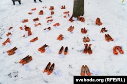 Актывісткі паўтарылі нашумелую акцыю: на белым сьнезе выставілі пафарбаваныя аранжавым туфлі. Кожная пара рэпрэзэнтуе чалавека, які загінуў ад хатняга гвалту. На пікеце тэму туфляў раскрылі крыху больш: актывісткі зачытвалі рэальныя гісторыі памерлых ахвяраў.