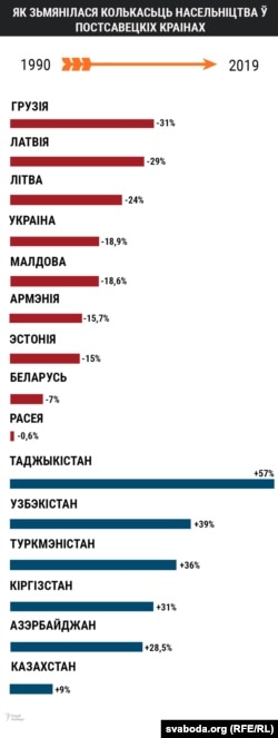 У Беларусі амаль за 30 гадоў стала на 7% менш жыхароў, у Грузіі — на 31%, ва Ўкраіне — на 18,9%, у Расеі — на 0,6%. Але ў некаторых былых савецкіх рэспубліках насельніцтва вырасла. Напрыклад, у Таджыкістане жыхароў стала больш на 57%. Гэта вынікае са статыстычных дадзеных гэтых краін.