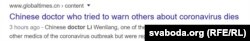Кітайскае англамоўнае дзяржаўнае выданьне Global Times памяняла сваё ранейшае паведамленьне, пра тое, што памёр доктар Лі Вэньлян, які першым папярэдзіў пра эпідэмію каранавірусу і сам заразіўся гэтай хваробай.