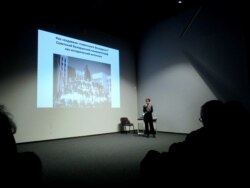 Вольга Раманава падчас лекцыі на тэму «Як стваралі „савецкага беларуса“?» у Кіеве