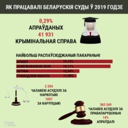 Паводле распаўсюджанага на прэс-канфэрэнцыі рэлізу, за мінулы год беларускія суды разгледзелі 41 931 крымінальную справу і асудзілі 38 726 чалавек. Гэта на 1886 асобаў менш, чым летась. У сярэднім кожны беларускі суд у 2019 годзе разглядаў 71 справу за месяц.