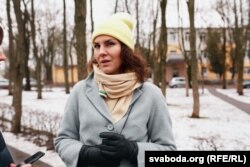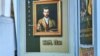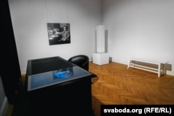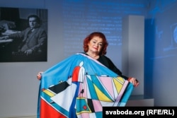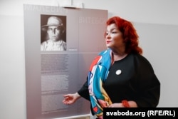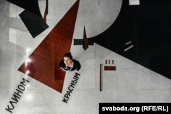 Праўнучка Эля Лісіцкага Валерыя на фоне агітацыйнага пляката УНОВІС «Клінам чырвоным бей белых» у Музэі гісторыі Віцебскай народнай мастацкай вучэльні Photo: svaboda.org (RFE/RL)