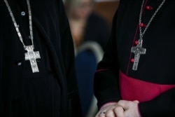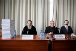 Прэс-сакратар Беларускай праваслаўнай царквы Сяргей Лепін і арцыбіскуп Тадэвуш Кандрусевіч на фоне стоса падпісных аркушаў Photo: svaboda.org (RFE/RL)
