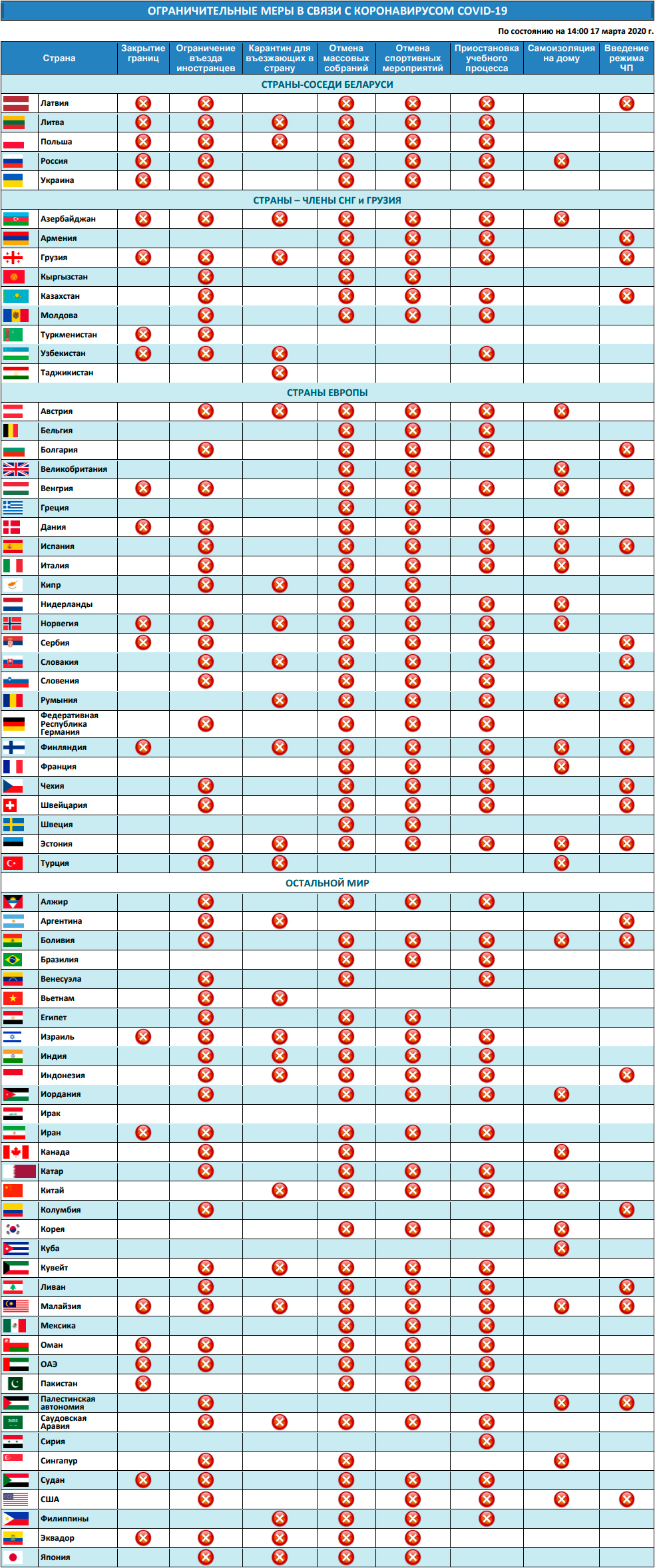 Міністэрства замежных справаў Беларусі выдала табліцу з параўнаньнем забаронаў, уведзеных у розных краінах сьвету ў сувязі з пандэміяй COVID-19.