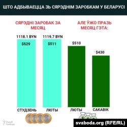 Па дадзеных Белстату, у студзені сярэдні заробак у Беларусі складаў 1118 рублёў, паводле сярэднемесячнага курсу гэта 529 даляраў. У лютым за такія грошы можна было купіць ужо 510 даляраў.