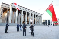 Мікалай Арцюхоў з руху «Адзінства» 25 сакавіка выйшаў на Кастрычніцкую плошчу з двума сьцягамі: бел-чырвона-белым і чырвона-зялёным.
