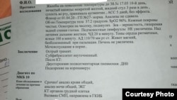 Сёння, 5 красавіка, яна зьвярнулася ў прыватны мэдычны цэнтар ЛОДЭ, дзе ёй зрабілі рэнтген і КТ. Вынік — двухбаковая пнэўманія. У заключэньні таксама напісана, што ёсьць падазрэньне на каранавірус. Маці адвезьлі ў пульманалёгію 3-й бальніцы, там ужо ўзялі мазкі на каранавірус».