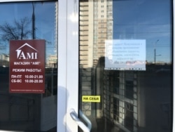 Абвестка на дзьвярах менскай крамы «Амі мэбля»