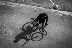 Герой прыехаў на сустрэчу на ровары. Мы гаворым зь ім пра шчасьце ў пакойчыку на некалькі квадратаў, які Dzieciuki арандуюць для рэпэтыцый у прамысловым будынку.