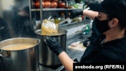 «Інакш нам не пасьпець, — кажа кухар Тацяна. Звычайна яна адказвае за супы, халодныя стравы, закускі. — Кухня не разьлічаная на такія аб’ёмы. У звычайныя дні мы працуем па індывідуальнай замове, не гатуем у запас».