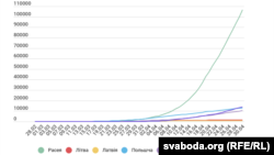 Графік клікабэльны: можна прыбіраць краіны і параўноўваць дзьве ці тры, для гэтага трэба націснуць на кружочкі каля краін