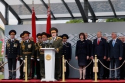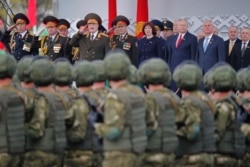 Лукашэнка ў вайсковым мундзіры прымае парад у Менску