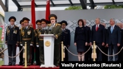 Разам з Лукашэнкам на гэтую трыбуну зайшлі кіраўнікі ўраду і Нацыянальнага сходу. Справа ад Лукашэнкі стаяць старшыня Савету Рэспублікі Натальля Качанава, прэмʼер-міністар Беларусі Сяргей Румас і старшыня Палаты прадстаўнікоў Уладзімер Андрэйчанка.