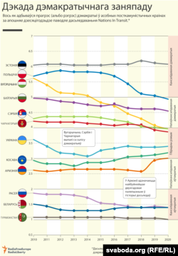 Амэрыканскія экспэрты праводзяць гэтыя дасьледаваньні шмат гадоў. У апошнія дзесяцігодзьдзе яны адзначаюць зьніжэньне сярэдняга ўзроўню дэмакратыі ў постсавецкіх краінах.