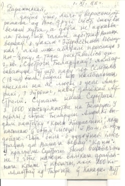 Даўно ўжо, яшчэ ў верасьні, атрымала ад Вас другі ліст, ішоў ён вельмі хутка, а не адказвала я таму, што чакала адбіткаў з цыклю «Эўфрасіньні Полацкай», якія мне абяцалі прыслаць з Ню-Ёрку, а тады рыхтаваліся да гэтак званай Сустрэчы Беларусаў, што адбываюцца тут што пару год. Сёлетняя, найбольшая, прыехалі на яе людзі з усяе Амэрыкі, з Эўропы, нават з далёкай Аўстраліі. Супала наша сустрэча з 1000-годзьдзем хрысьціянства на Беларусі. У сувязі з гэтым беларусы Амэрыкі выдалі паштоўку Крыж Эўфрасіньні, якую пасылаю ў гэтым лісьце Вам, а ну ж дойдзе. Гэта была б цудоўная ілюстрацыя да Вашага верша «Крыж».