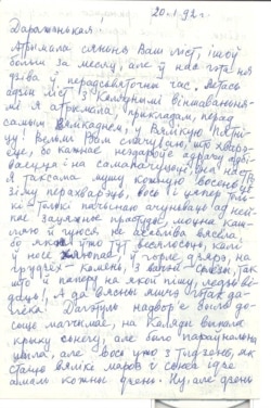 Мы тут перажываем, што ў Беларусі ўсё перамянілася захутка, баюся, што людзі будуць яшчэ больш пакутаваць, і таму не магу, не ўмею цешыцца, што Беларусь ужо не БССР, а Belarus, як пішуць цяпер тут газэты, і шмат хто дзівіцца, што ў маёй паэзіі я аптымістка, а на сучаснасьць гляджу пэсымістычна. Ну дай, Божа, каб усё скончылася добра. Цалую моцна.
