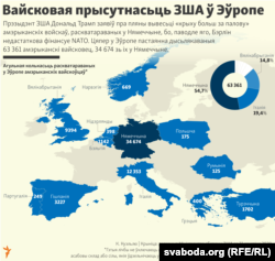 Прэзыдэнт ЗША Дональд Трамп заявіў пра пляны вывесьці «крыху больш за палову» амэрыканскіх войскаў, раскватараваных у Нямеччыне, бо, паводле яго, Бэрлін недастаткова фінансуе NATO. Цяпер у Эўропе пастаянна дысьлякаваныя 63 361 амэрыканскі вайсковец, 34 674 зь іх у Нямеччыне.