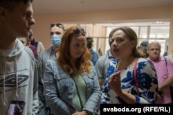 Актывісты Ежы Грыгенча (першы зьлева), Юлія Карначава (другая зьлева) і патэнцыйная кандыдатка ў прэзыдэнты Ганна Канапацкая (трэцяя зьлева) на судзе ў Горадні