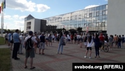 Першы перадвыбарчы пікет Сьвятланы Ціханоўскай у Магілёве пад бел-чырвона-белымі сьцягамі. ВІДЭА