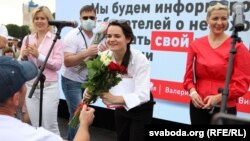 Здымачная група тэлеканалу «Настоящее время» правяла цэлы дзень, 19 ліпеня, з кандыдаткай у прэзыдэнты Сьвятланай Ціханоўскай і яе паплечніцамі Марыяй Калесьнікавай і Веранікай Цапкалай.