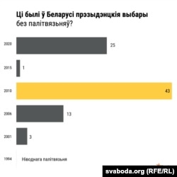 Паводле праваабаронцаў, у Беларусі цяпер 25 палітвязьняў. Зьняволеньне большасьці зь іх зьвязанае з удзелам у выбарчай кампаніі: гэта прэтэндэнты ў кандыдаты, кіраўнікі і сябры ініцыятыўных групаў, блогеры. Беларускія ўлады дэманструюць «беспрэцэдэнтны ўзровень ціску на ўдзельнікаў сёлетняга выбарчага працэсу», заявілі аўтары кампаніі назіраньня «Праваабаронцы за свабодныя выбары». Гэта шостыя прэзыдэнцкія выбары ў Беларусі. Ці былі палітвязьні падчас ранейшых прэзыдэнцкіх выбарчых кампаній у Беларусі?
