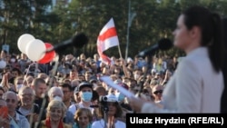 «Народ стаміўся ад пустых абяцаньняў. Нязгодным затыкаюць раты і кідаюць за краты. Цяпер, калі я стала кандыдатам, я ежджу па гарадах, як калісьці езьдзіў Сяргей Ціханоўскі», — сказала на мітынгу Сьвятлана Ціханоўская.