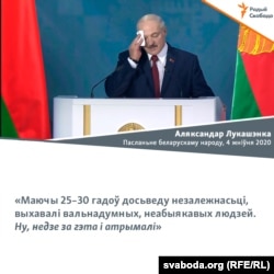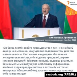 «Калі нашыя кандыдаты або вечныя экспэрты-эканамісты, якія нідзе не працавалі, акрамя інтэрнэт-форумаў і Telegram-каналаў, ведаюць рэцэпт, як без сацыяльных выбухаў па-асабліваму рэфармаваць асобныя дзяржпрадпрыемствы, я гатовы іх ня толькі выслухаць. Абяцаю любому даць магчымасьць паказаць сябе на практыцы», — сказаў Лукашэнка.