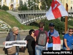 Удзельнікі акцыі трымаюць плякаты з надпісамі «Свабоду Беларусі», «Люблю Беларусь», «Не палітычным рэпрэсіям, не катаваньням у турмах», «Я за сумленныя выбары».