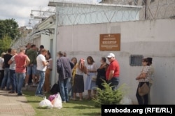 З свайго заплечніка Анастасія дастае ўпакоўку з-пад сьцяга і паказвае яе тым, хто прыйшоў да ізалятара перадаць зьняволеным родзічам перадачы.