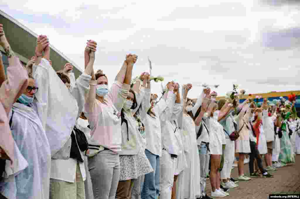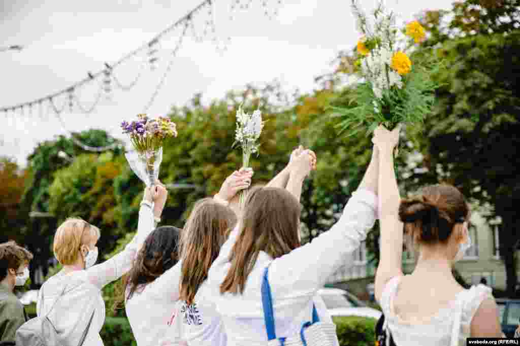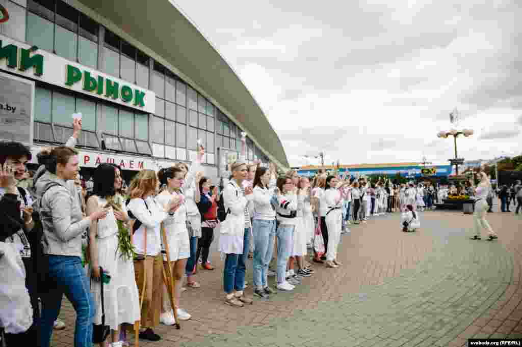 Каля Камароўскага рынку ў Менску некалькі соцень дзяўчат сталі з кветкамі ў доўгі ланцуг. Гэта акцыя салідарнасці з тымі, хто ў гэтыя дні пакутуе ад гвалту.