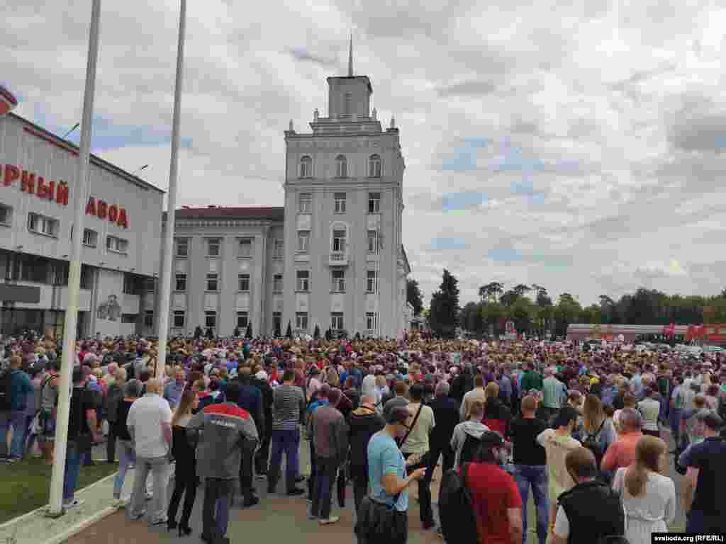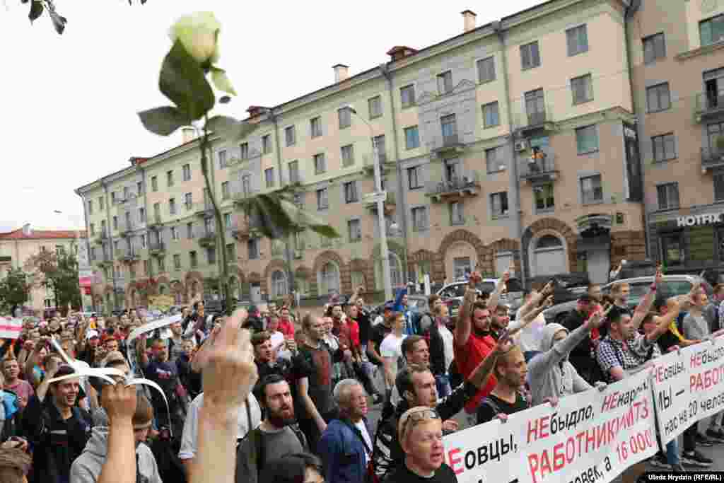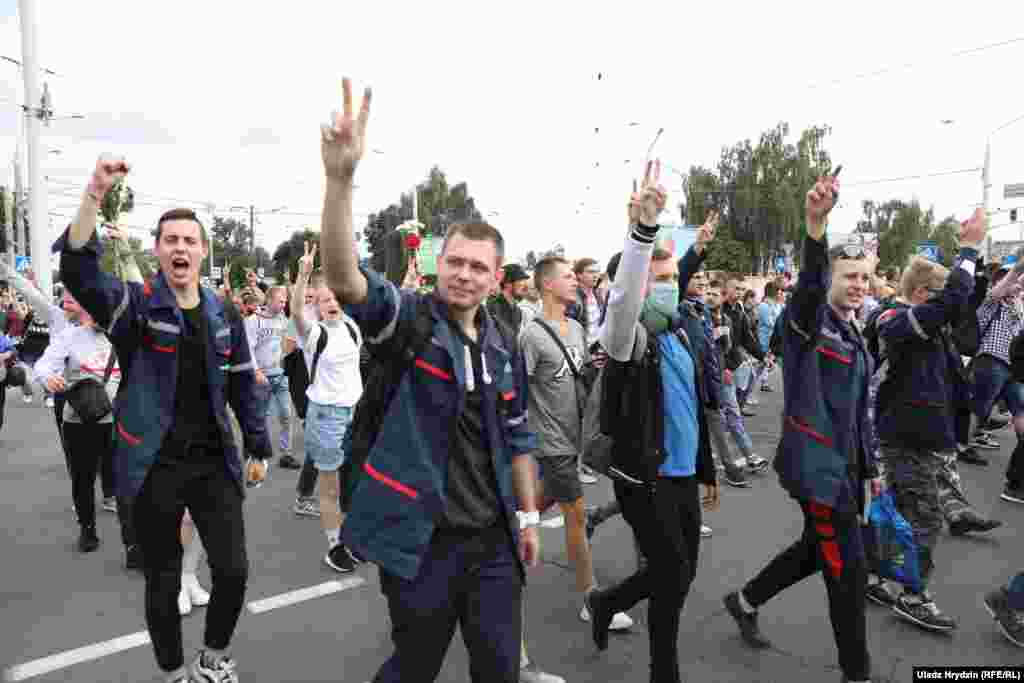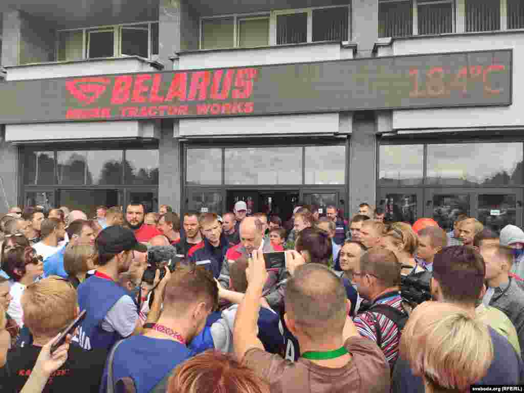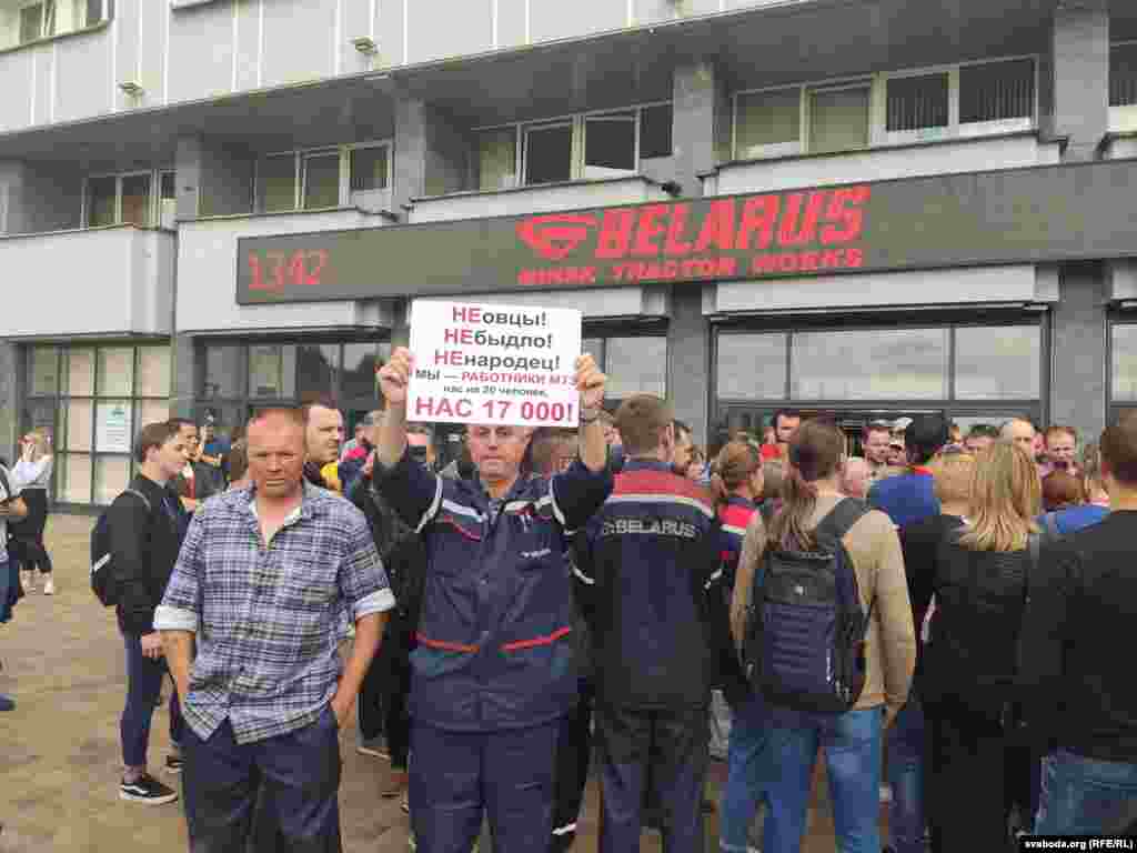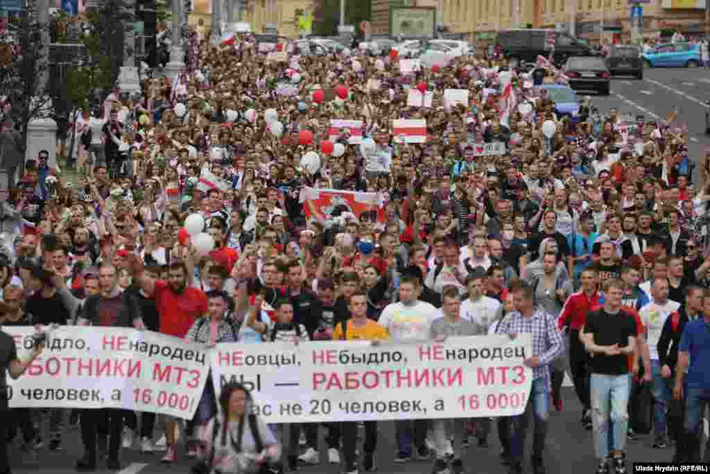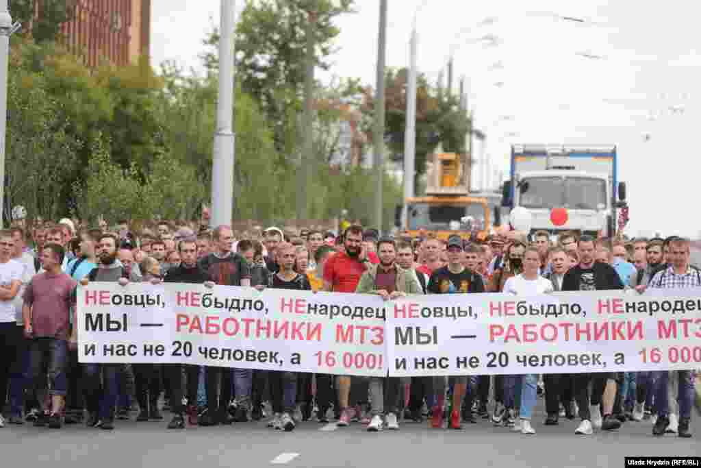 На пляцоўцы за прахадной Менскага трактарнага заводу (МТЗ) 14 жніўня адбыўся мітынг рабочых. На МТЗ прыехаў прэм’ер-міністар Раман Галоўчанка, але праігнараваў мітынгоўцаў на плошчы перад заводам і пайшоў да адміністрацыі МТЗ. Рабочыя пачалі марш да Дому ўраду. Вось як гэта было.