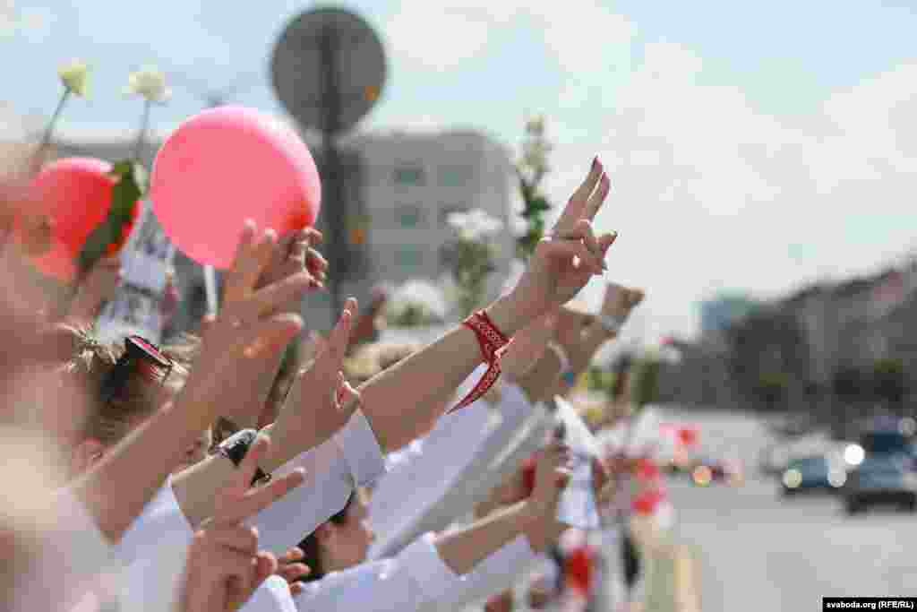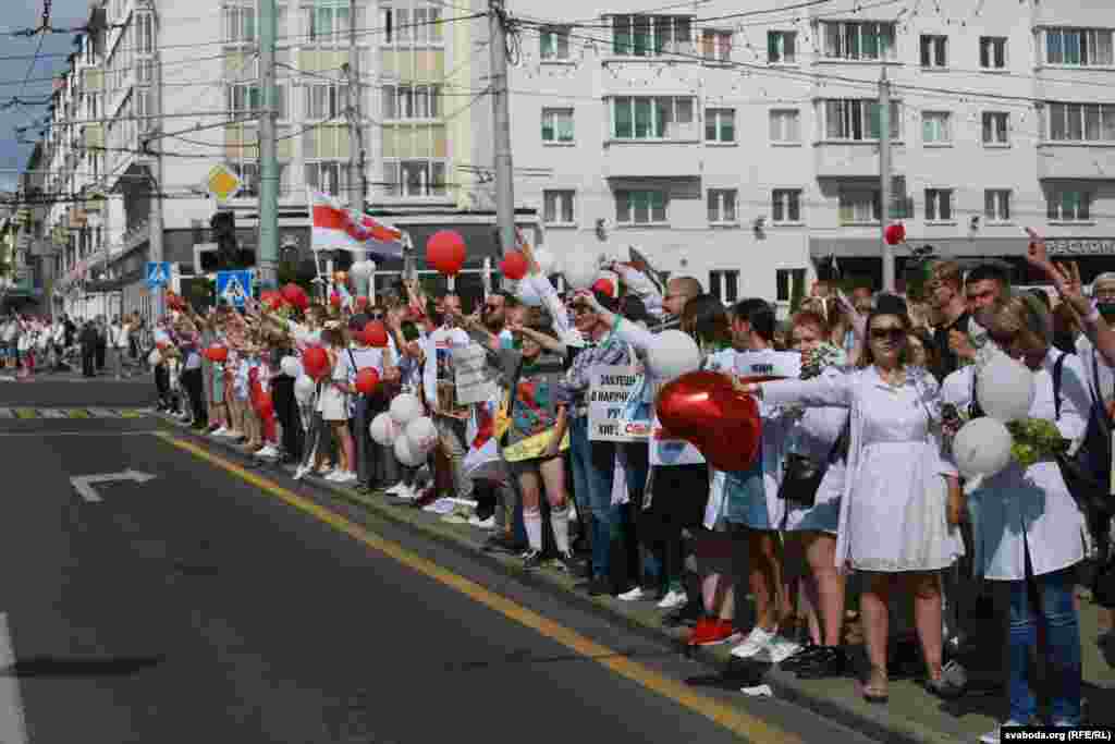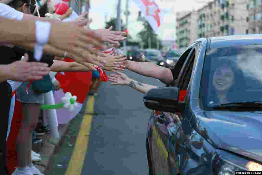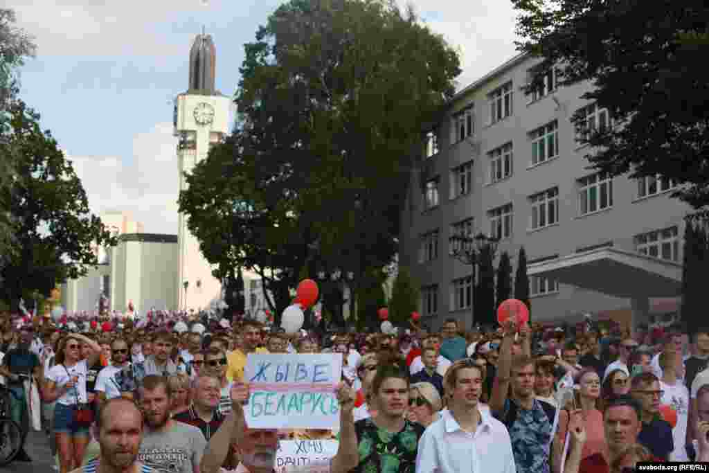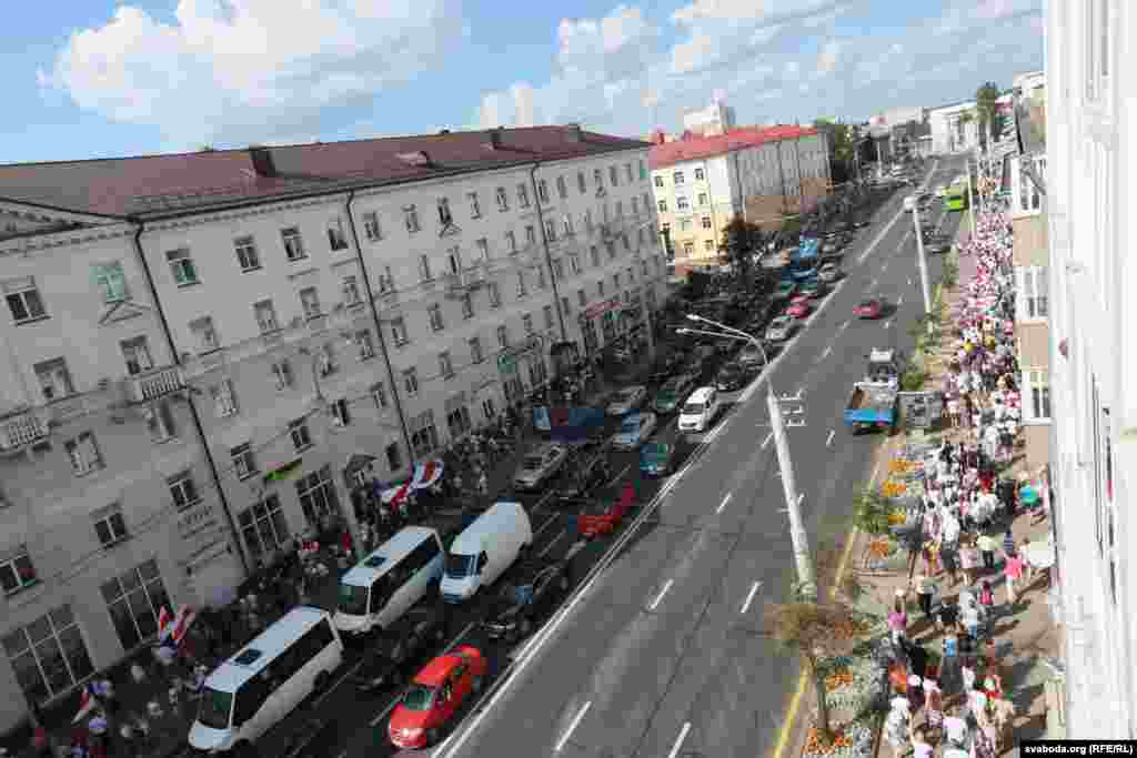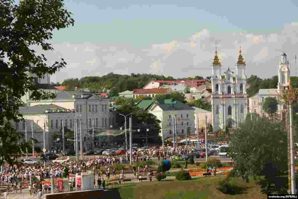 Жыхары Віцебску выйшлі на вуліцы гораду зь мірным пратэстам. Cотні людзей з кветкамі, балёнікамі, бел-чырвона-белымі сьцягамі ідуць у бок плошчы Перамогі.
