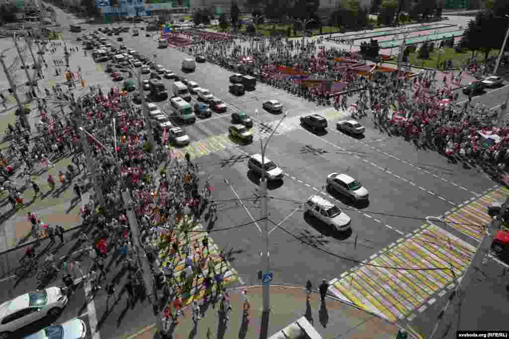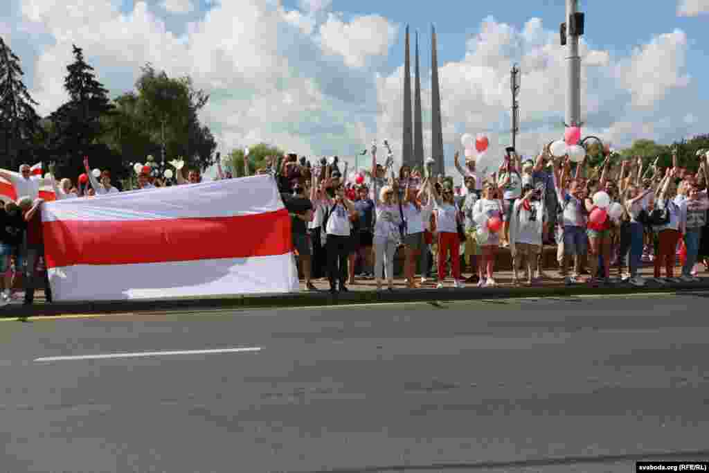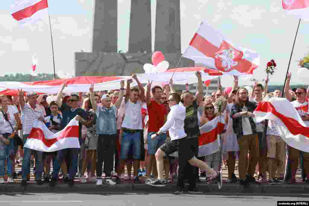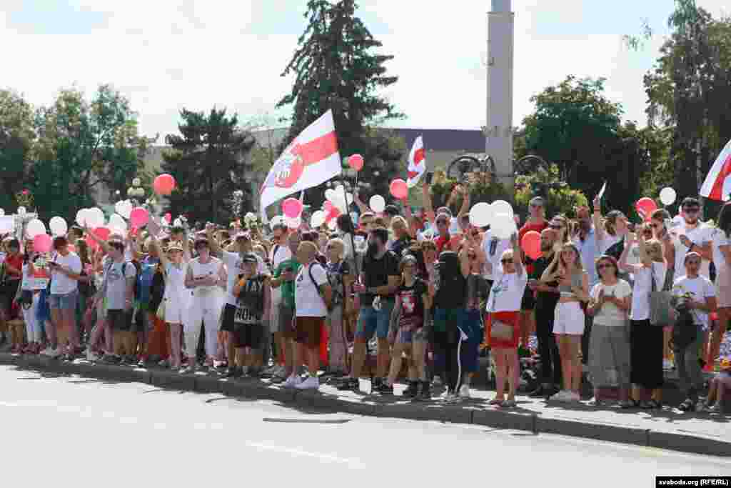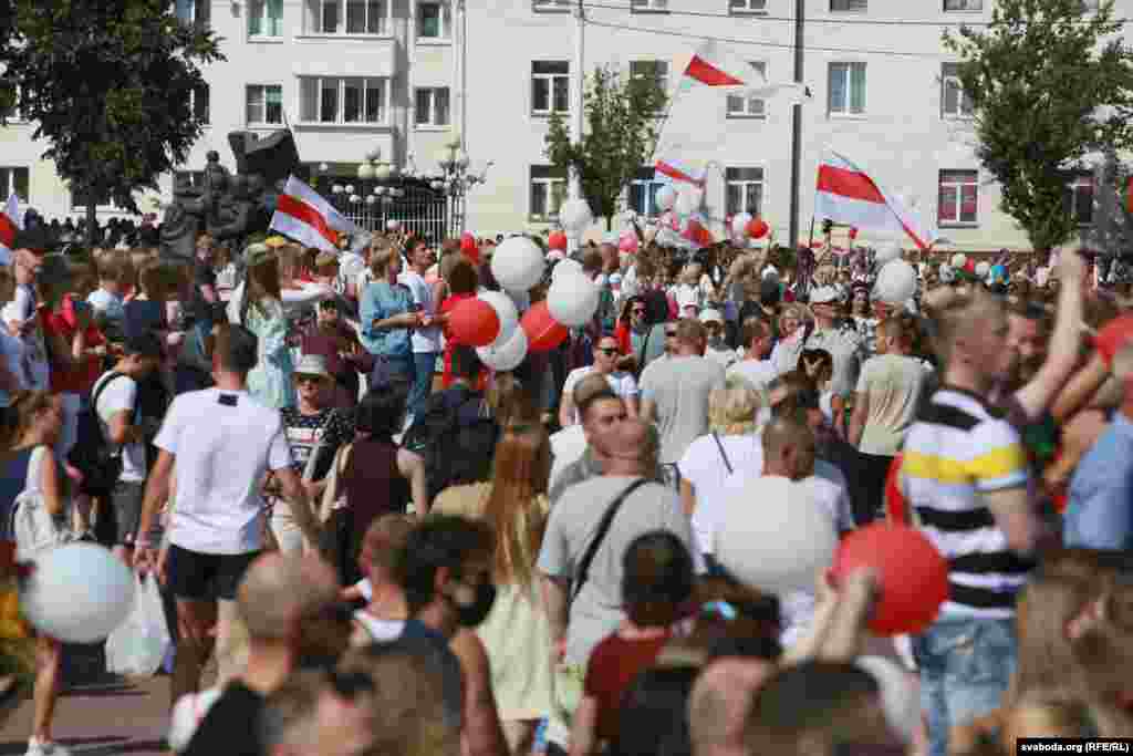 Частка плошчы Перамогі агароджаная. Большасьць людзей стаіць на баку мэмарыялу каля фантанаў. Людзі, якія падыходзяць, займаюць ходнікі вуліцы Леніна, Калініна.
