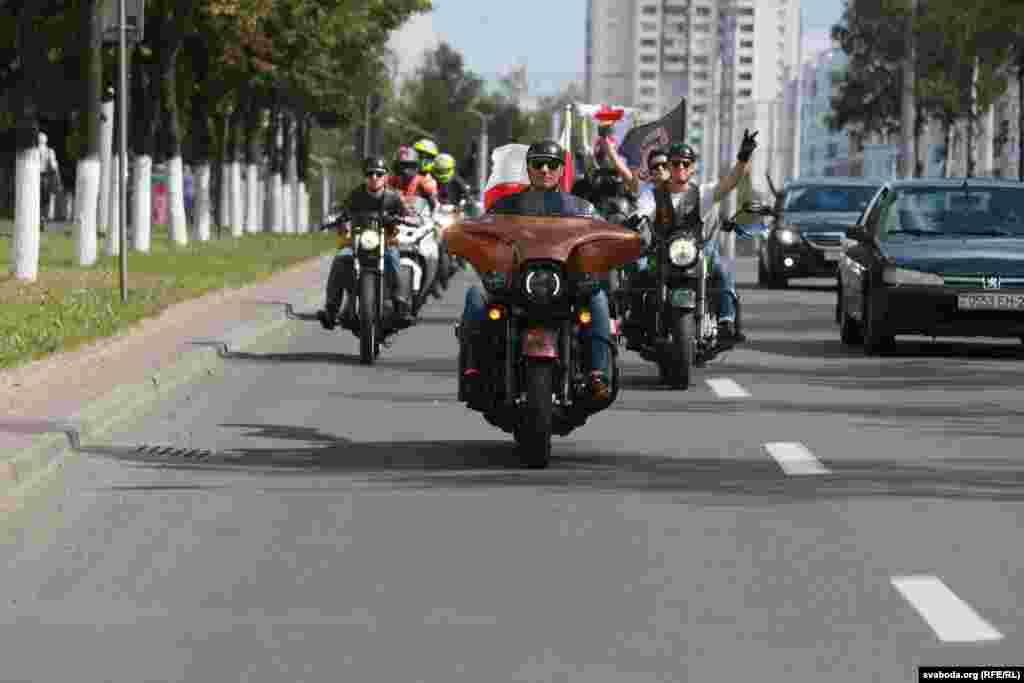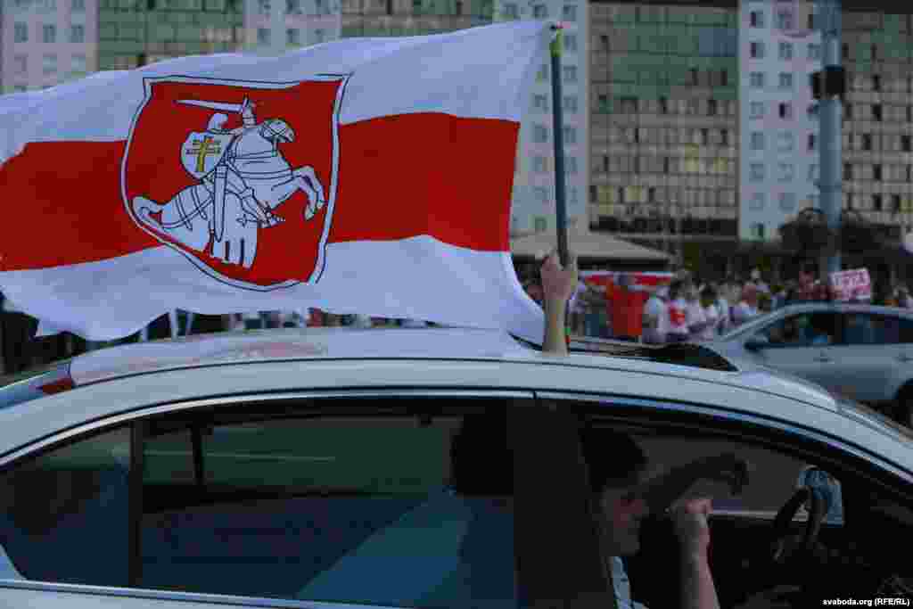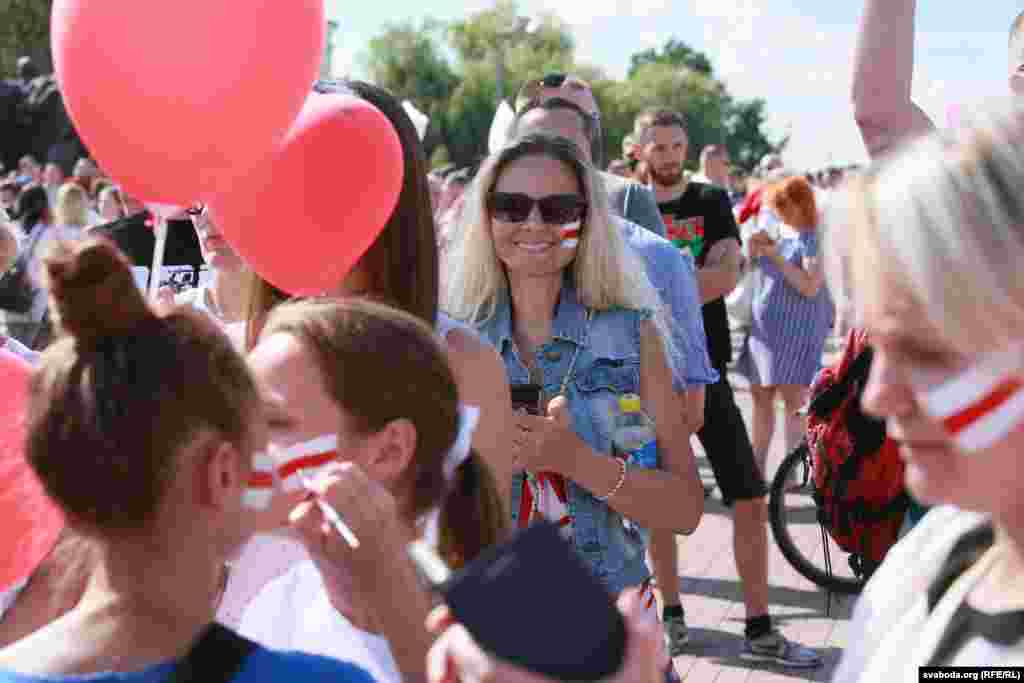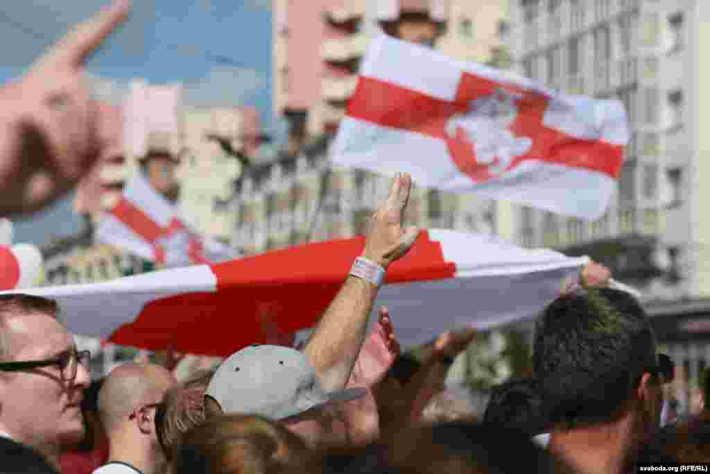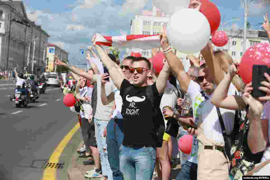 Частка плошчы Перамогі агароджаная. Большасьць людзей стаіць на баку мэмарыялу каля фантанаў. Людзі, якія падыходзяць, займаюць ходнікі вуліцы Леніна, Калініна.