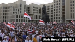 На помніку Леніну зьявіліся розныя плякаты, у тым ліку «Ціханоўская наш прэзыдэнт». Людзі скандуюць: «Трыбунал!», «Сыходзь!», «Звольнены!», «Свабоду палітвязьням!».