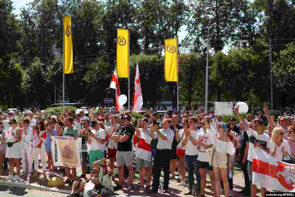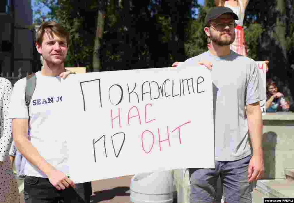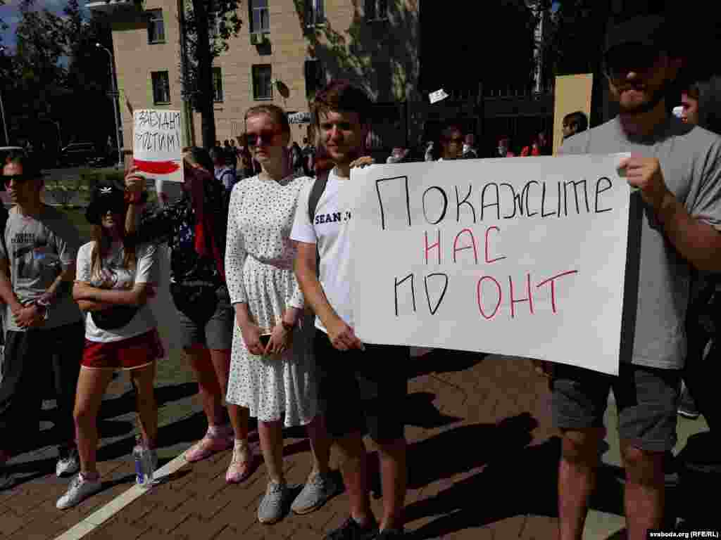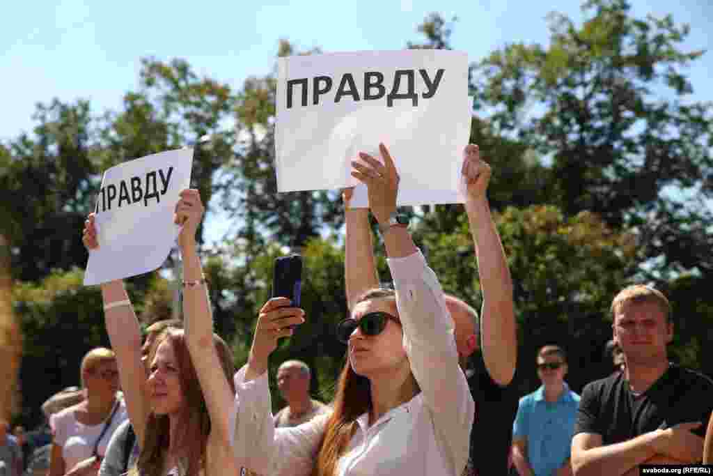 Людзі трымаюць плякаты «Праўду», «Пакажыце людзям праўду», бел-чырвона-белыя сьцягі.