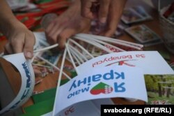 «У нас акцыя праходзіць па ўсёй краіне, ва ўсіх гарадах, усіх запрашаем на мітынг за незалежнасьць нашай краіны. Паштовачку можаце родным перадаць. Вазьміце стужачку», — ветліва і нясьмела казалі маладзёны новенькім, хто да іх падыходзіў.