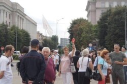 Удзельніцы жаночай акцыі сабраліся а 13 гадзіне каля гомельскага касцёла. Яны плянавалі стаць ланцугом да ўнівэрмагу.