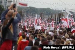 16.30 Людзі ідуць праезнай часткай праспэкту Незалежнасьці праз Кастрычніцкую плошчу, паведамляе карэспандэнт Свабоды, у бок плошчы Перамогі, частка натоўпу аддзялілася і пайшла ў раён праспэкту Пераможцаў.