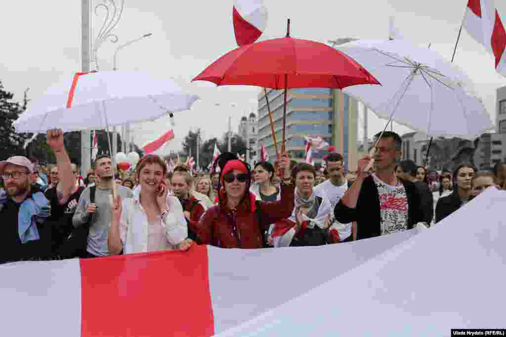 У Менску сёньня адбываецца Марш новай Беларусі. У пачатку дня падаў додж і здавалася, што акцыя будзе менш шматлікай. Але дождж скончыўся і вуліцы гораду запоўнілі дзясяткі тысяч людзей зь бел-чырвона-белымі сьцягамі. Самі ўдзельнікі мяркуюць, што яна больш шматлікая, чым тыдзень таму, 16 жніўня.